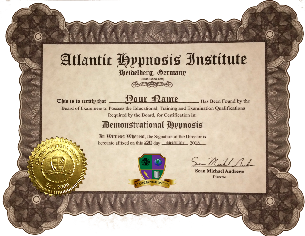 Enrollment includes 12 concentrated online lessons (iOs/Android compatible), The Street Cut project course-ware manual, my popular eBook "How to Choose the Best Volunteers", Online Examination credentials, and a Certificate in Demonstrational Hypnosis from the Atlantic Hypnosis Institute.